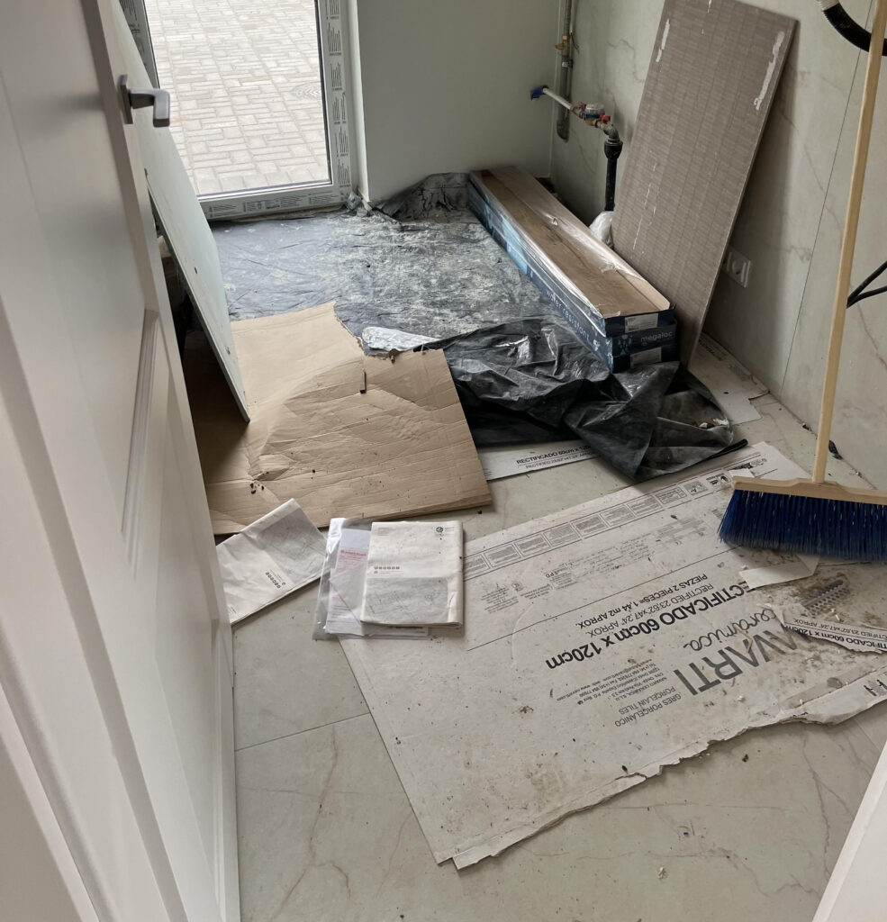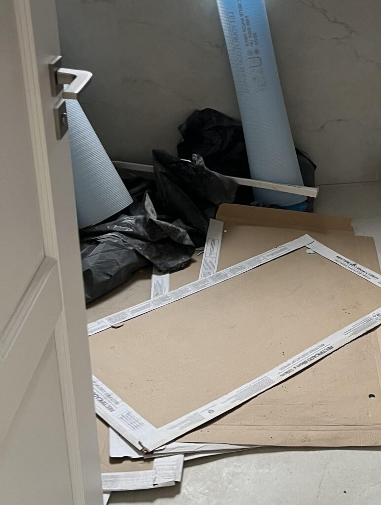 1. Šiukšlių išsinešimas iš namo: įvairiausių pakuočių, blokelių, maišų, net gipso sienelė buvo palikta;